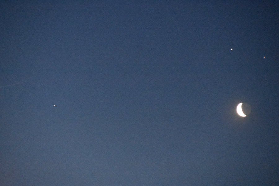 Last Wednesday, when I went to retrieve the Buffalo News, I discovered this pleasant surprise in the pre-dawn southern sky. It’s a waning or descending halfmoon, accompanied by Jupiter, Mars, and Saturn. Jupiter is the bright one, almost directly above the moon. Mars has it’s characteristic red tint, and is to the right of the moon. And Saturn is fainter (at over 800 million miles from Earth), appearing closer to the left edge of the photo. I scurried back into the house and grabbed my DSLR with the 300 mm lens and managed to get a half decent shot handheld. If I was certain that I could get it in before sunrise, I would have set up my camera tripod. Now I’m glad that I didn’t take the time, otherwise, I would have missed the shot.